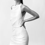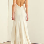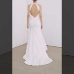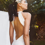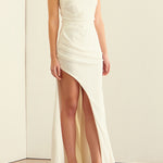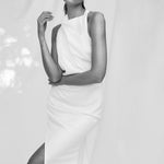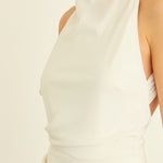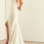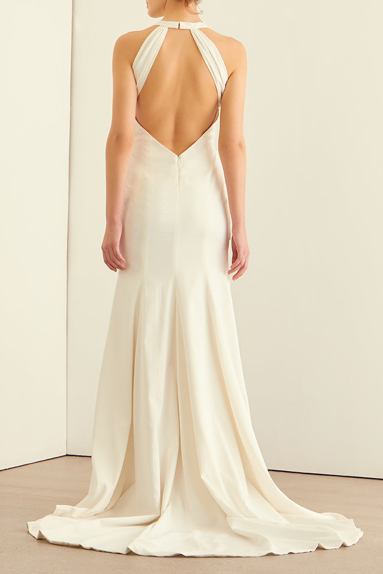 This modern halter-style neckline gown in matte satin highlighted by a unique draping twist detail and high front slit features a minimal yet chic aesthetic that feels timeless and undoubtedly fashion-forward.