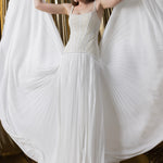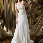 This gown features a square neckline with a corseted bodice, adorned with a unique hand-beaded technique (also available without embellishment, please inquire for pricing ).