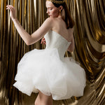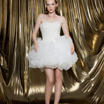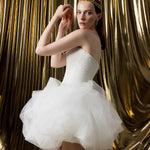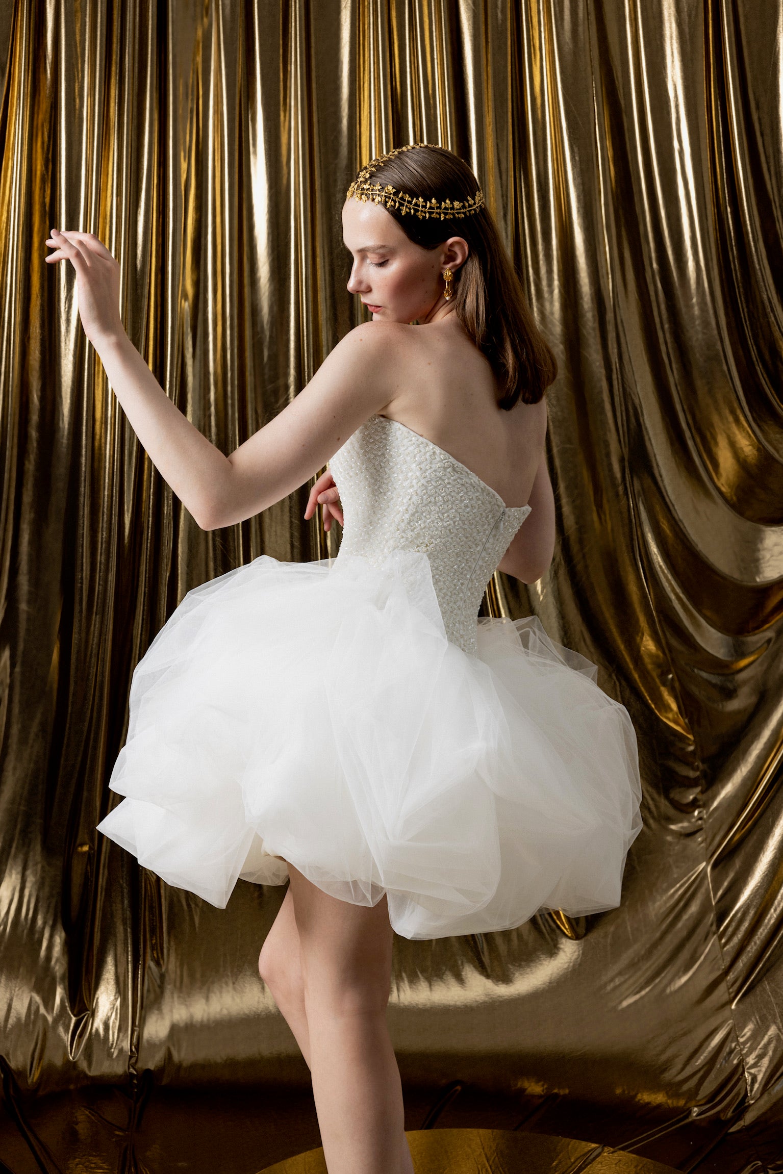 The ABRIL gown features a strapless bodice intricately embroidered with cut glass beads and pearls in a diamond pattern (for a version without hand embellishments, please inquire about pricing). The skirt is voluminous and airy, resembling a fluffy cloud with layers of hand-gathered tulle for a dramatic effect.