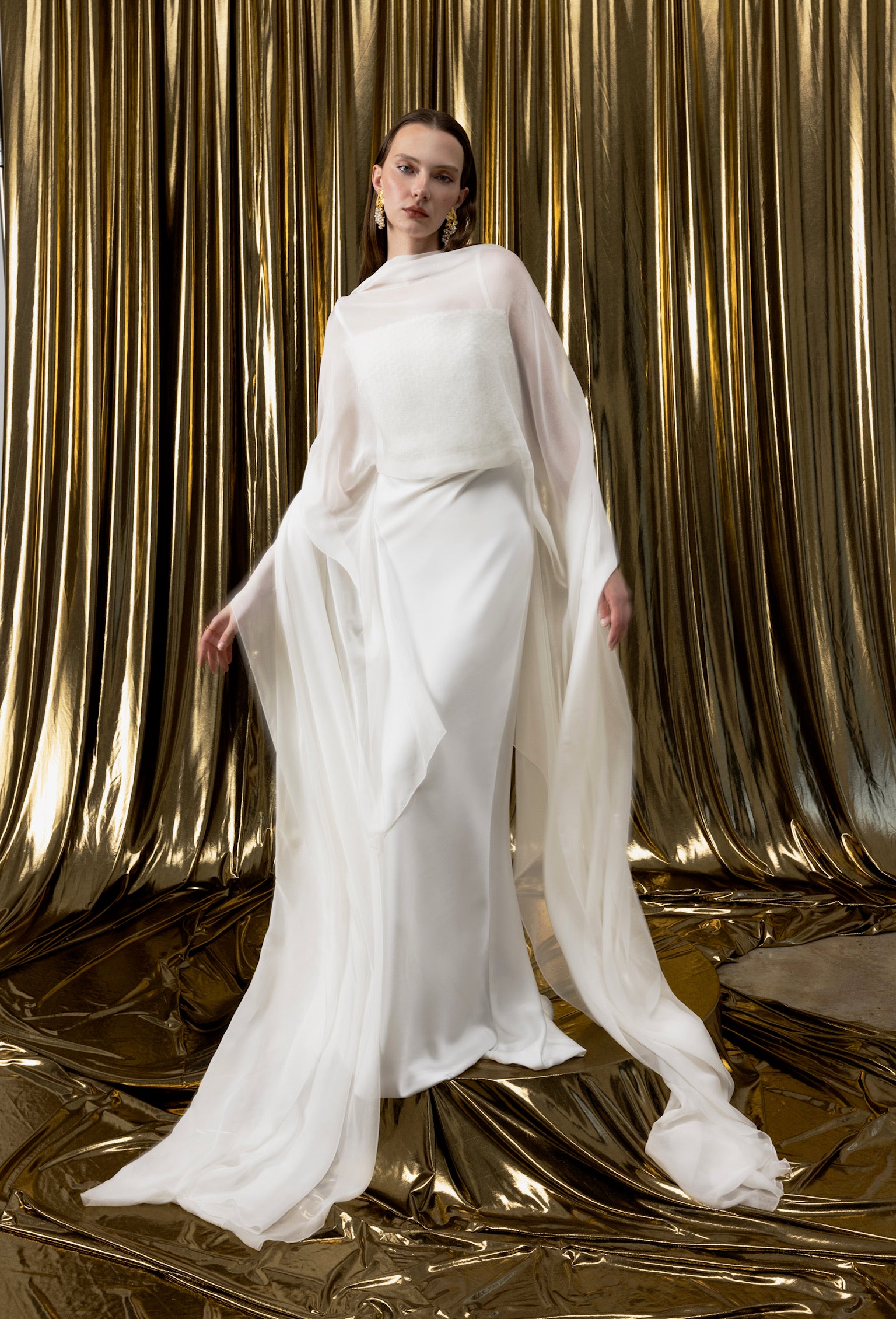 Its bodice, crafted from silk chiffon, reveals a delicately hand-embroidered bustier with cut glass beads, creating a subtle shimmer through the airy fabric, while the cape-like detail in the back adds a touch of ethereal grace.