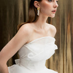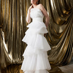 The SELI gown features crinkle organza ruffles and intricate cut glass beadwork. A Dupont satin belt adds a luxurious finish to this modern, sophisticated design.