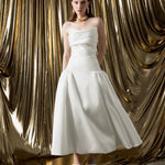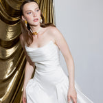 Crafted entirely from Mikado fabric, the VANES gown features a modern, geometric draped bodice. The skirt boasts a unique and original cut, gathered at the hips for a distinctive silhouette.