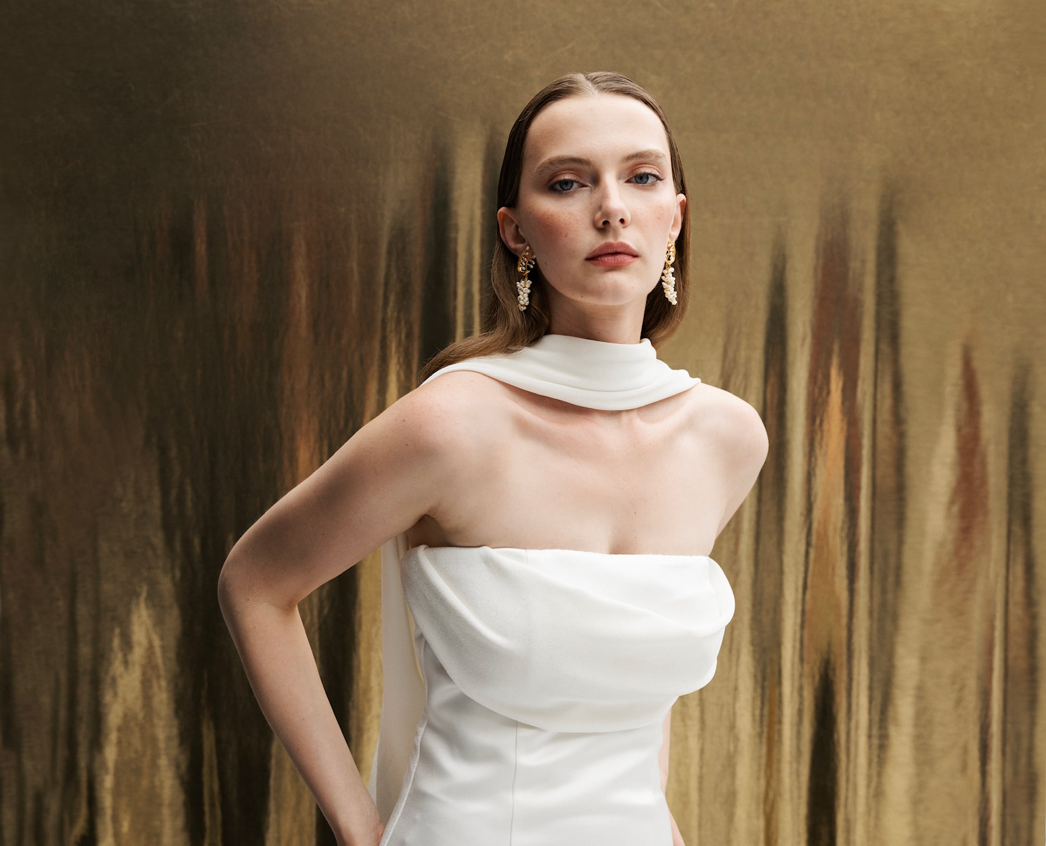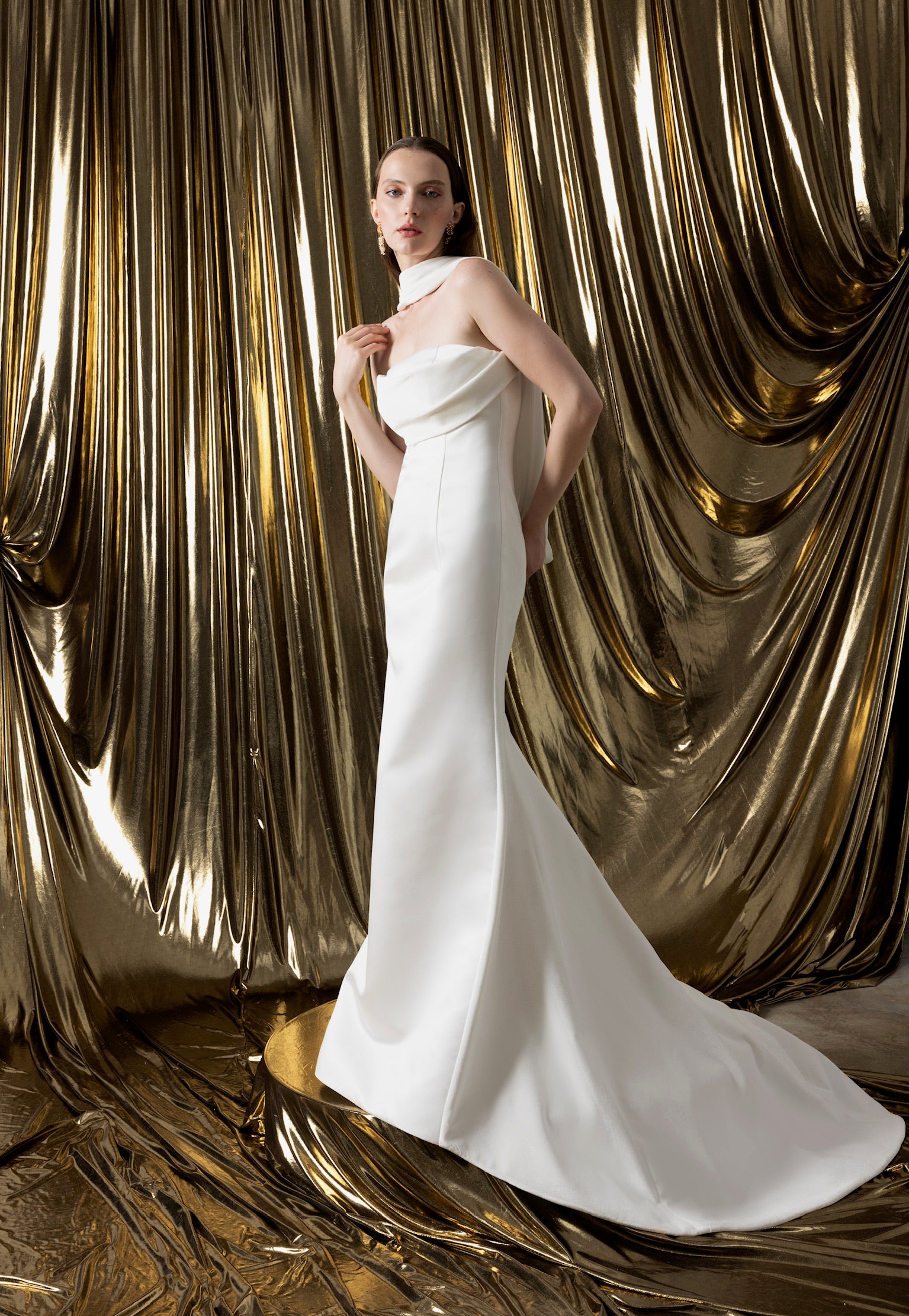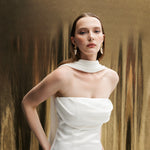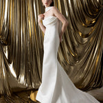 The MERIDA gown harmonizes the luxurious textures of Dupont satin on the front with