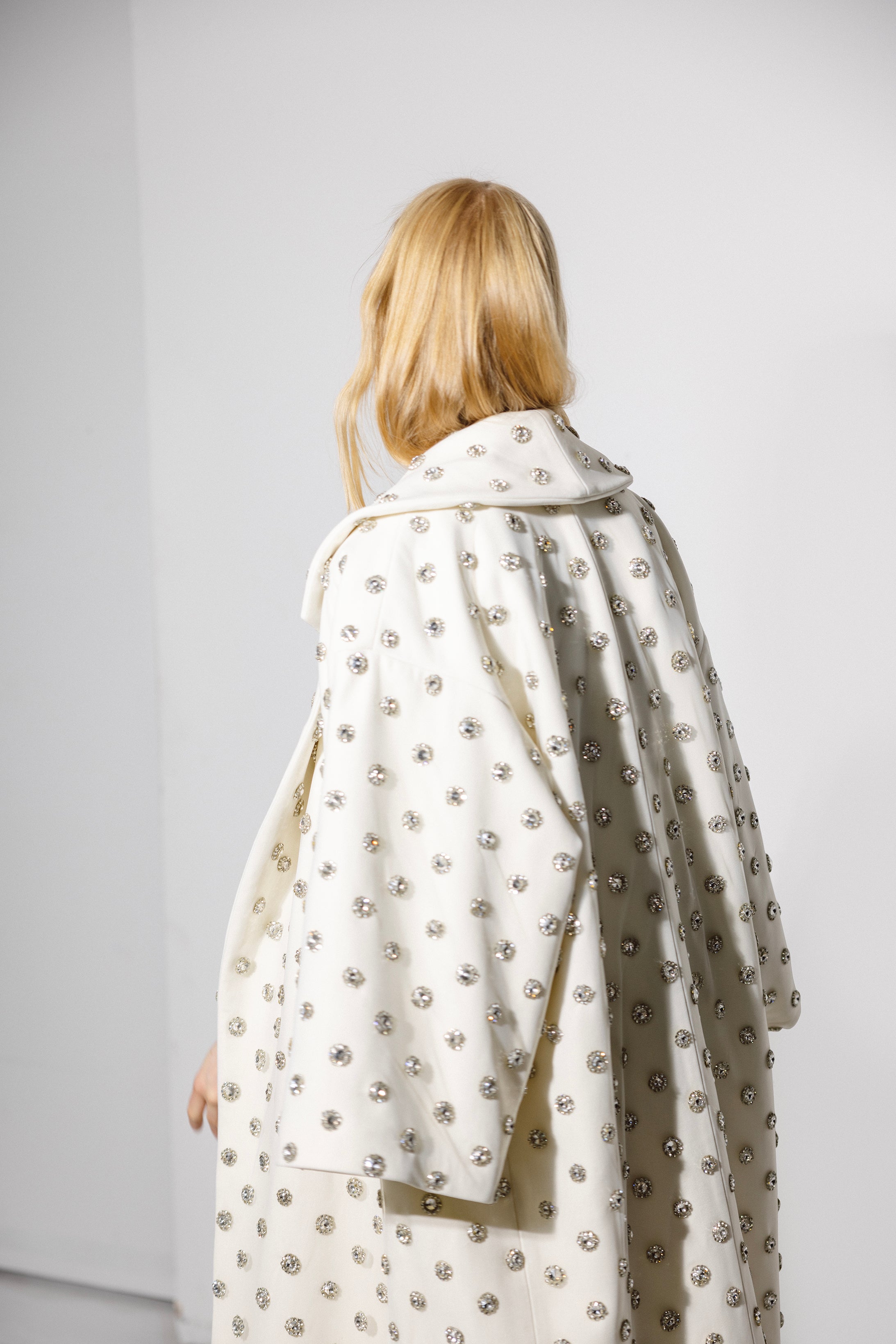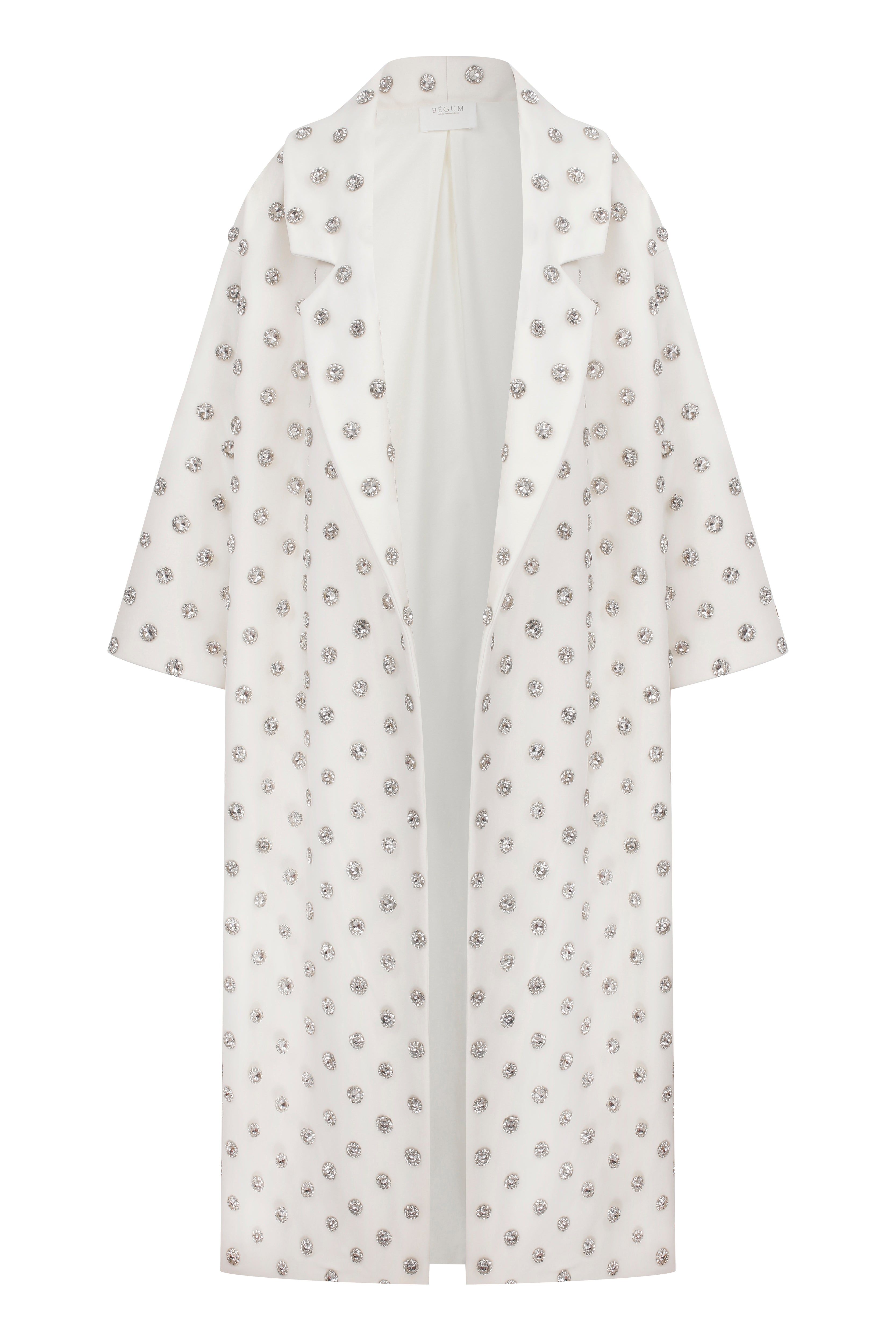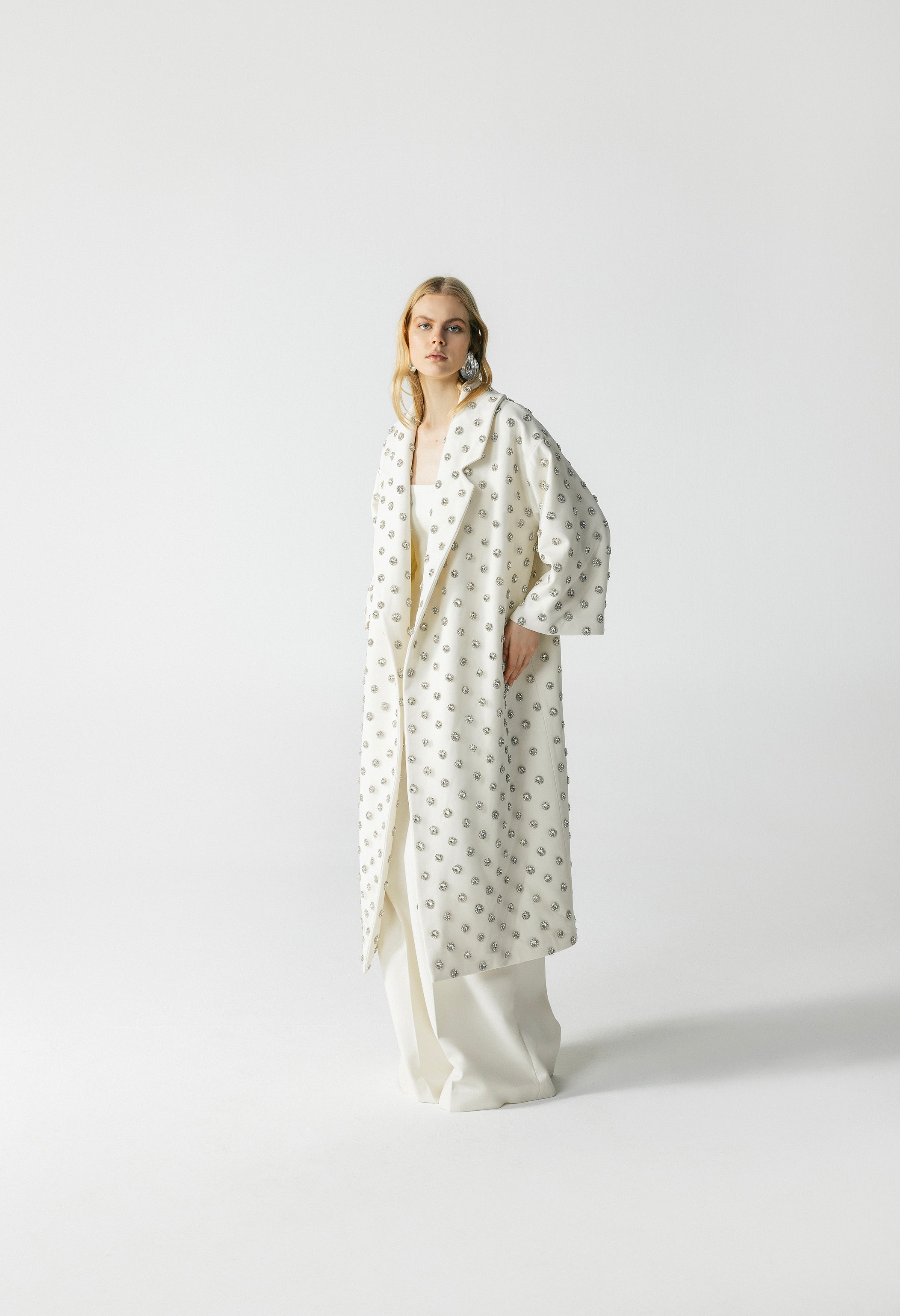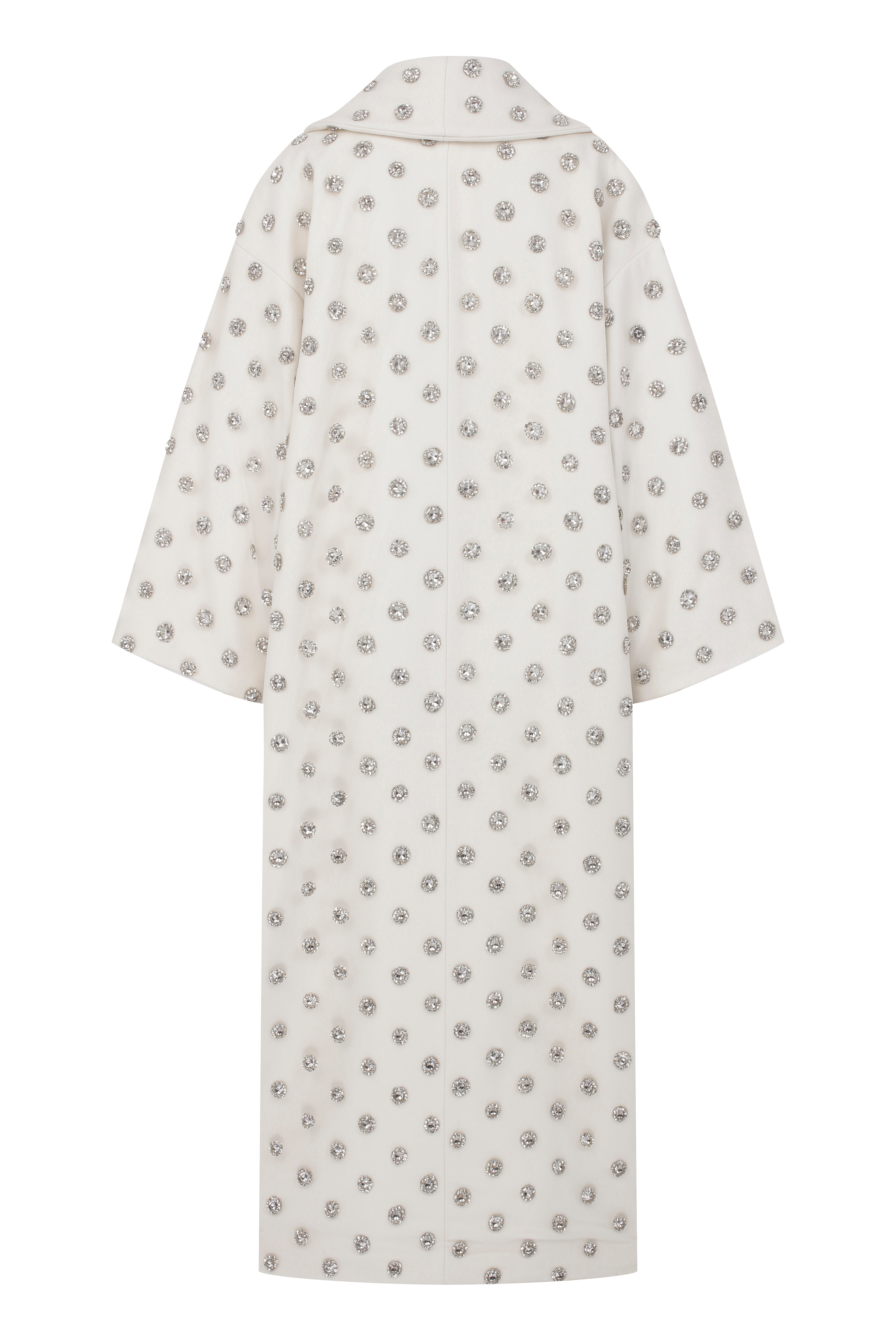 Wool crepe coat covered fully with handmade embroidered rhinestones.