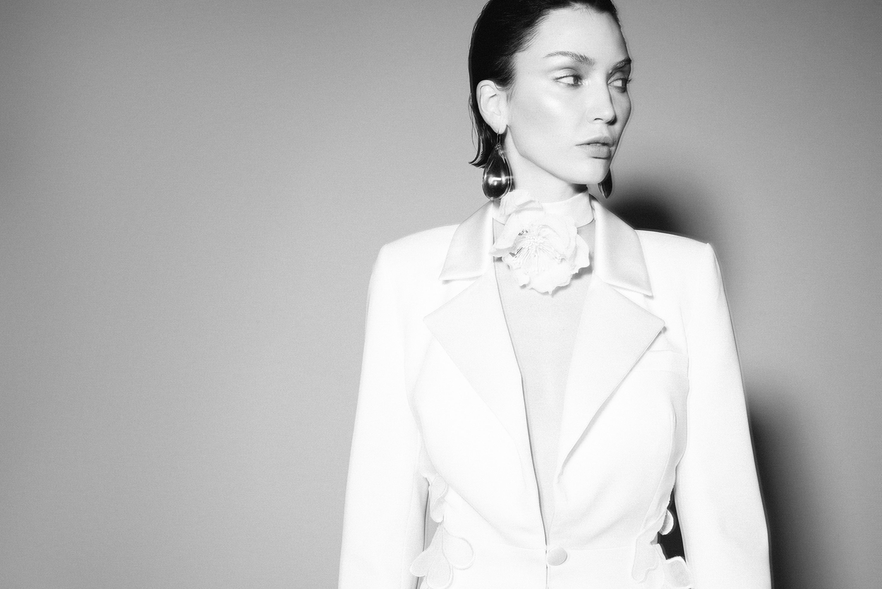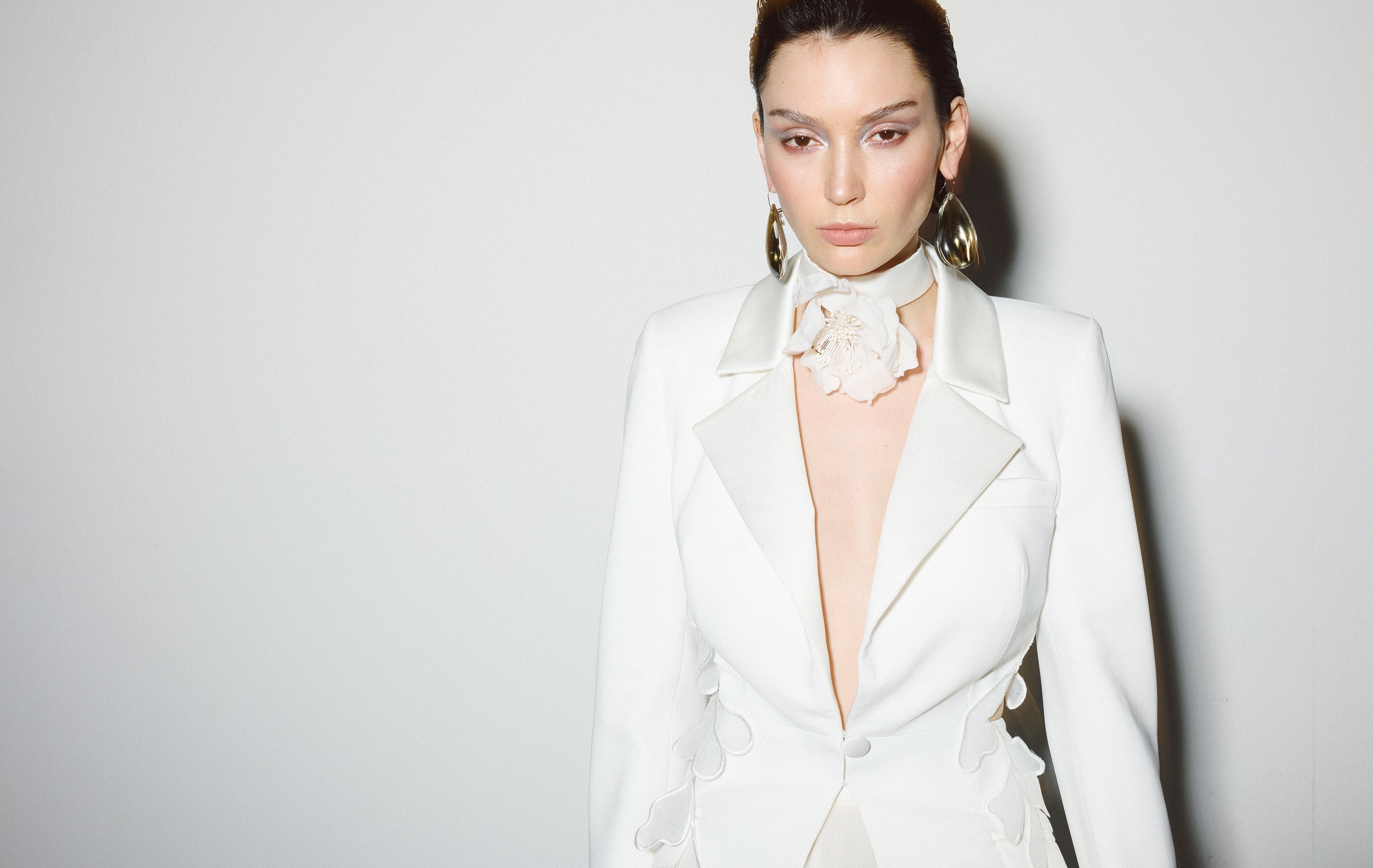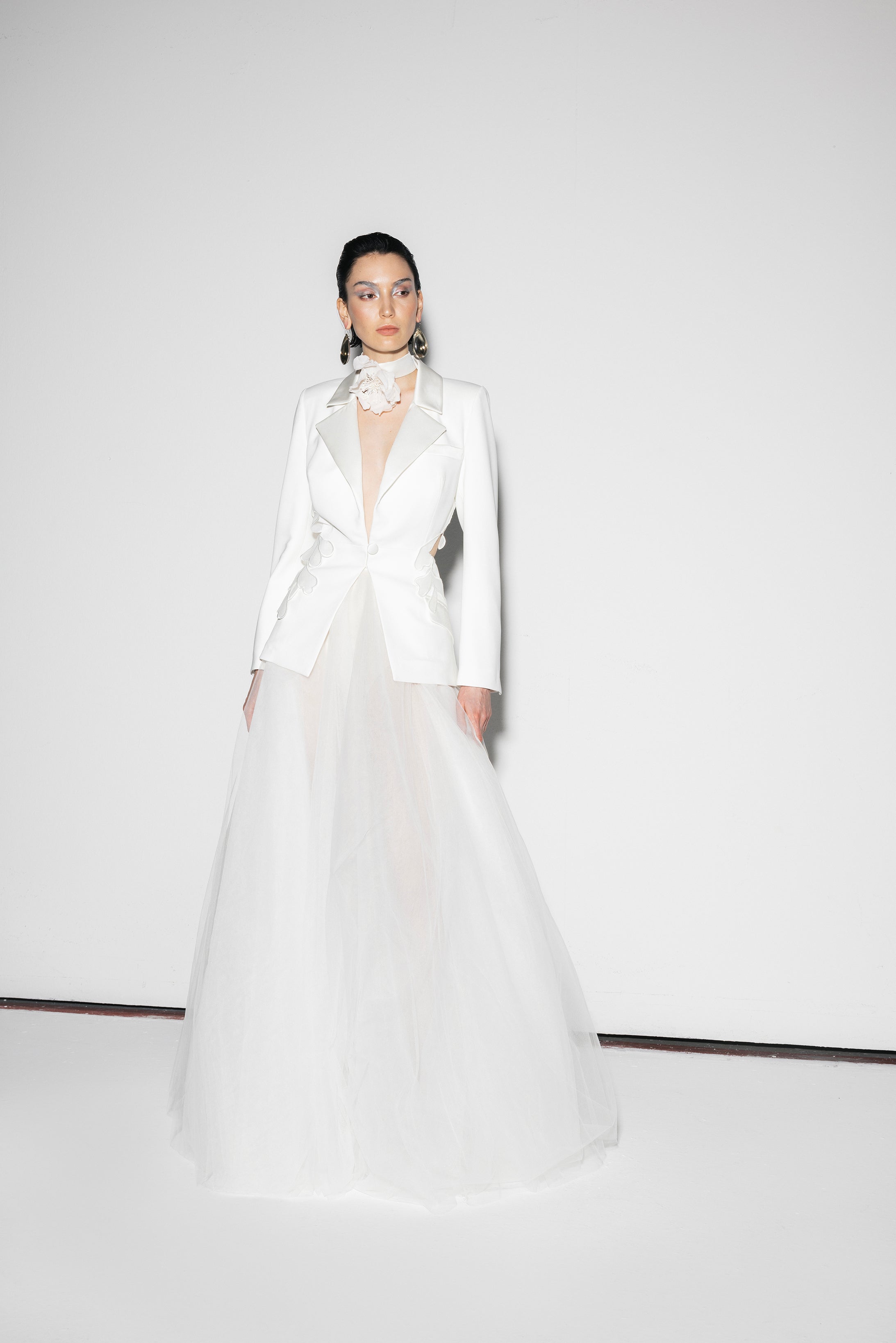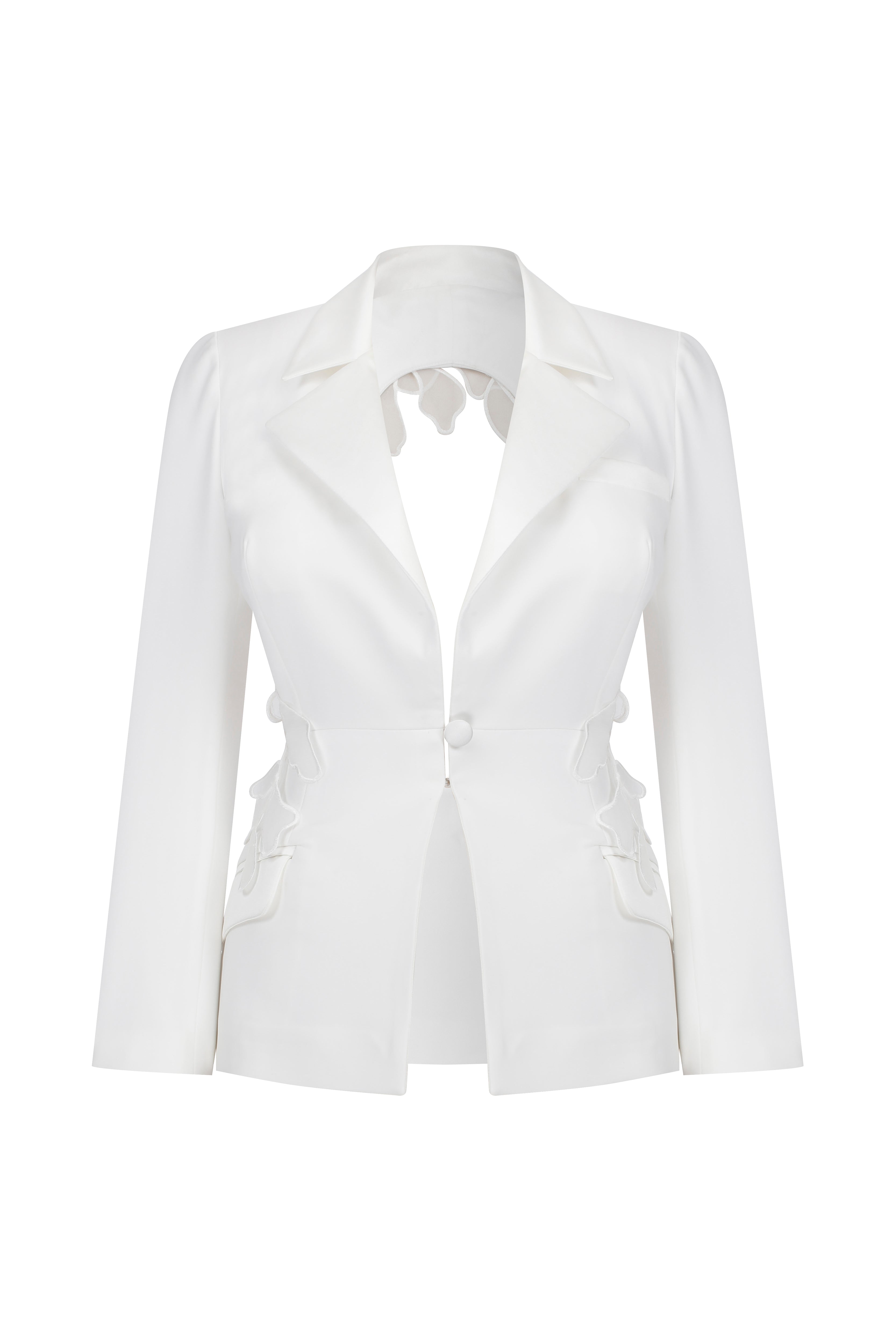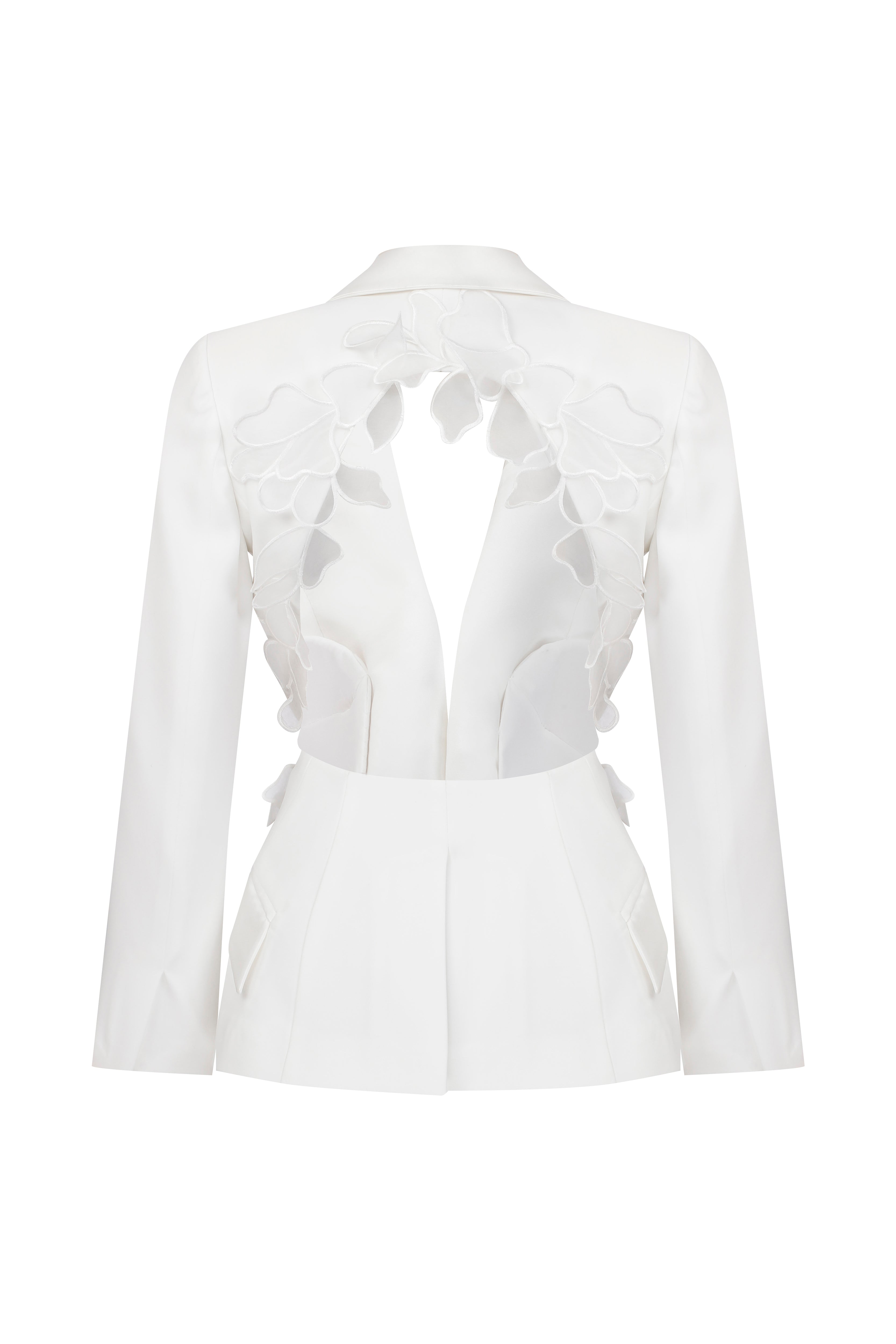 Crepe blazer with open back and 2D flower details and satin collars.
