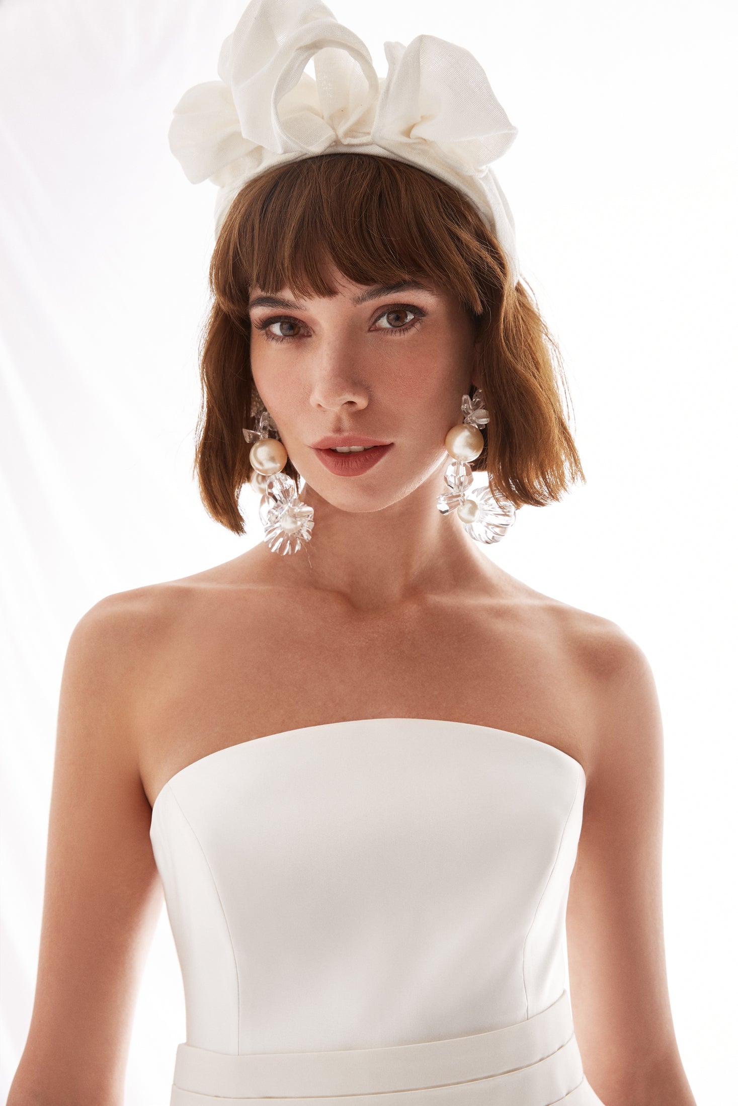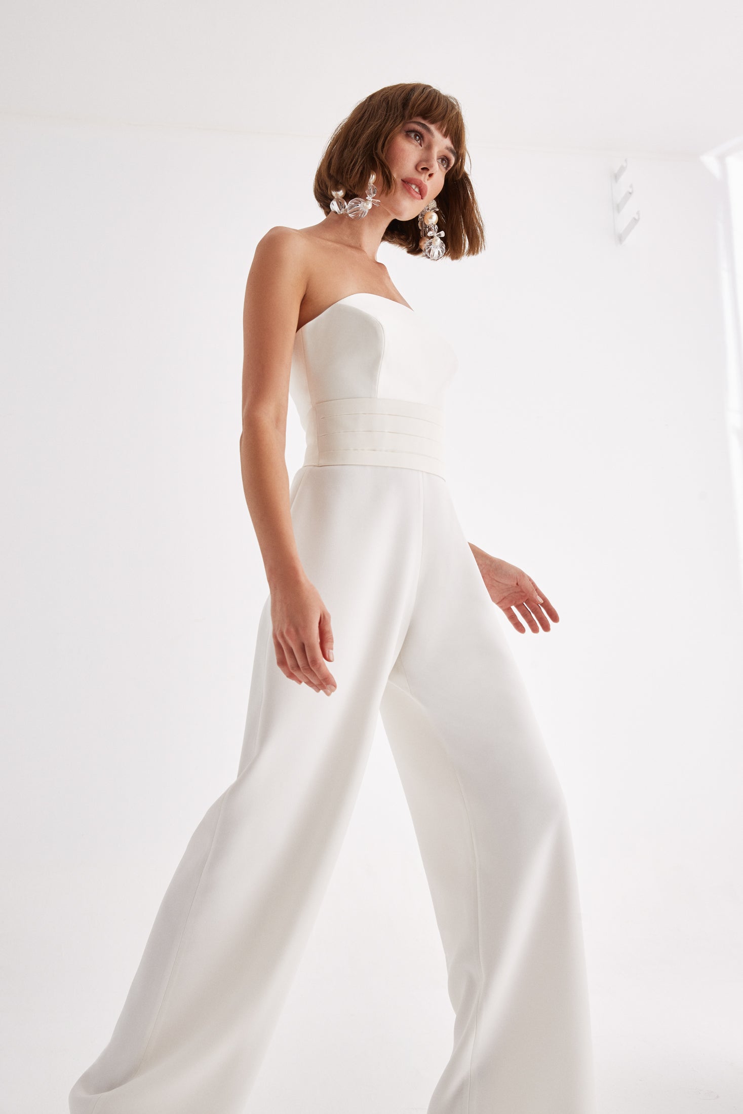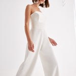 For city vibes, go for a sleek style that's modern, minimal, and wows with the perfect fit. Made of crepe pants and curved duchess satin strapless top, BELLA jumpsuit is a well tailored wide-leg trouser and a cool tuxedo band make for the most demur finishes.