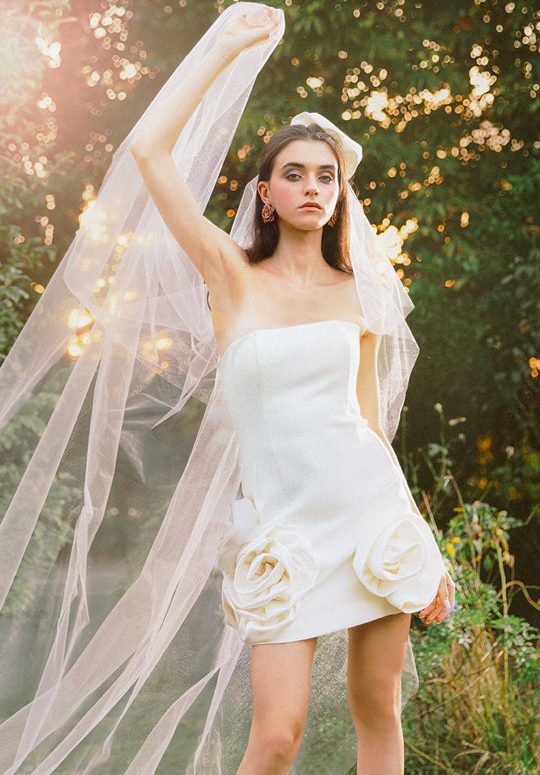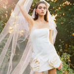 A strapless mini wool dress with a floral skirt detail. (This dress pairs with a matching CHARDON mini bolero jacket.)