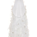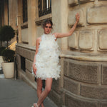 The Fleuris Mini is a sculptural celebration of romance — a couture halter dress adorned with hand-applied 3D floral appliqués and crystal-centered blossoms. Its dimensional texture and featherlight volume create a poetic silhouette, perfect for civil weddings, pre-wedding dinners, or after-party moments. Designed for brides who dare to bloom boldly.