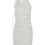 Jewel is the modern halter-style neckline after party dress in glitter fabric, highlighted by a unique draping twist detail and the organza bow on the neck features a fun yet romantic chic aesthetic that feels timeless and undoubtedly fashion-forward.