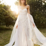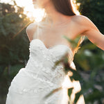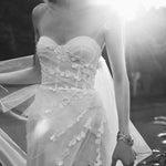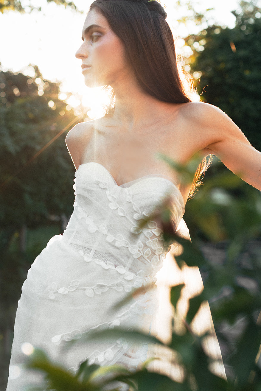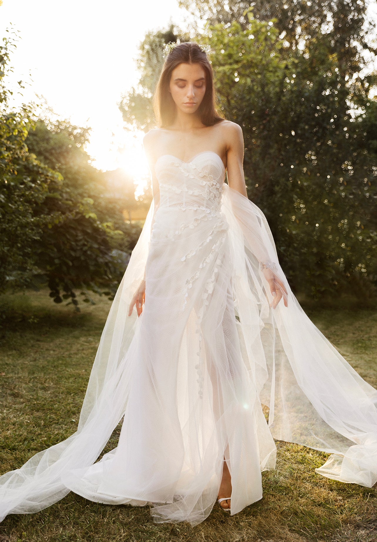 A tulle gown with a strapless corseted bustier and enveloping skirt, both adorned with floral embroidery and 3D organza flowers.