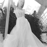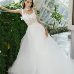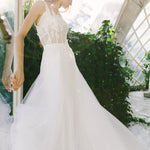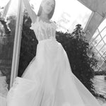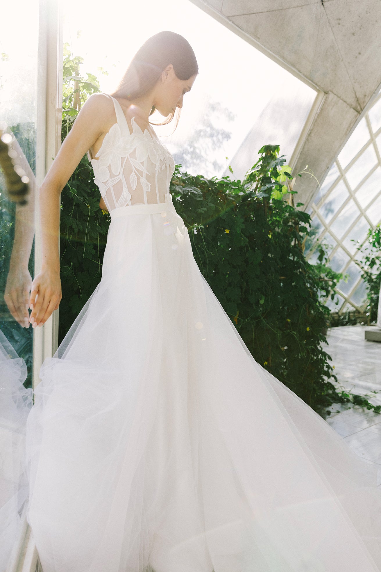 A tulle gown with a sheer corseted bodice, exquisitely embroidered with silk velvet floral appliqués, complemented by a separate, dramatic overskirt tail.