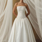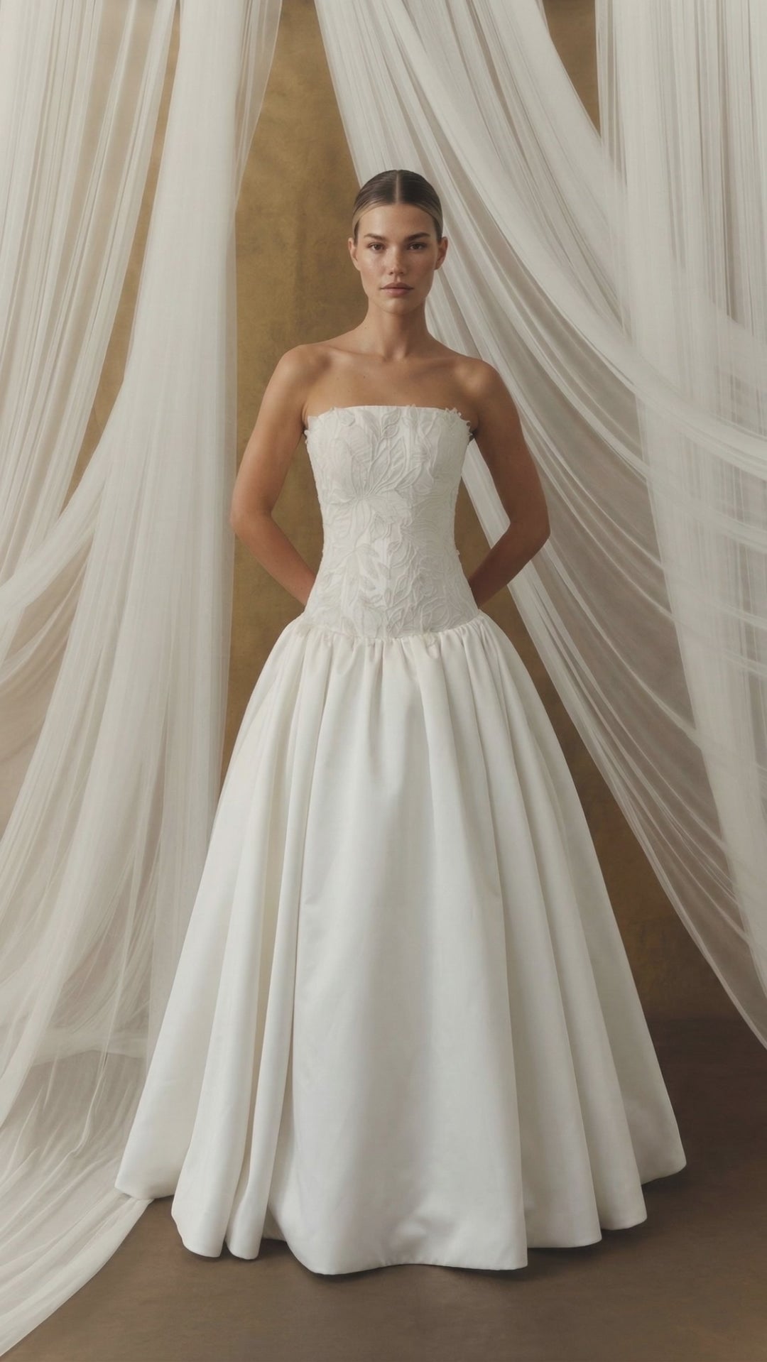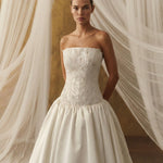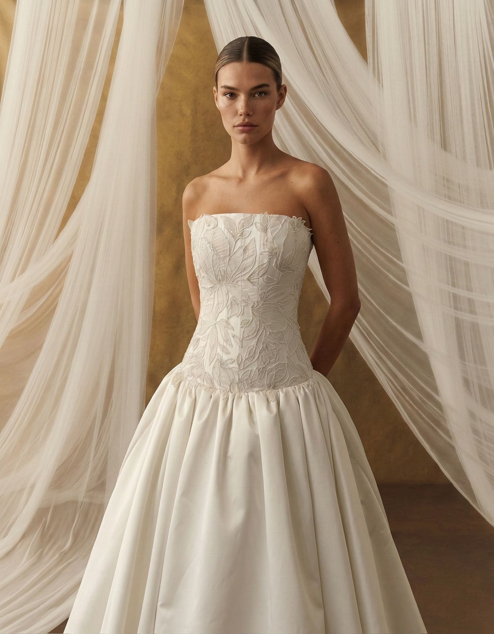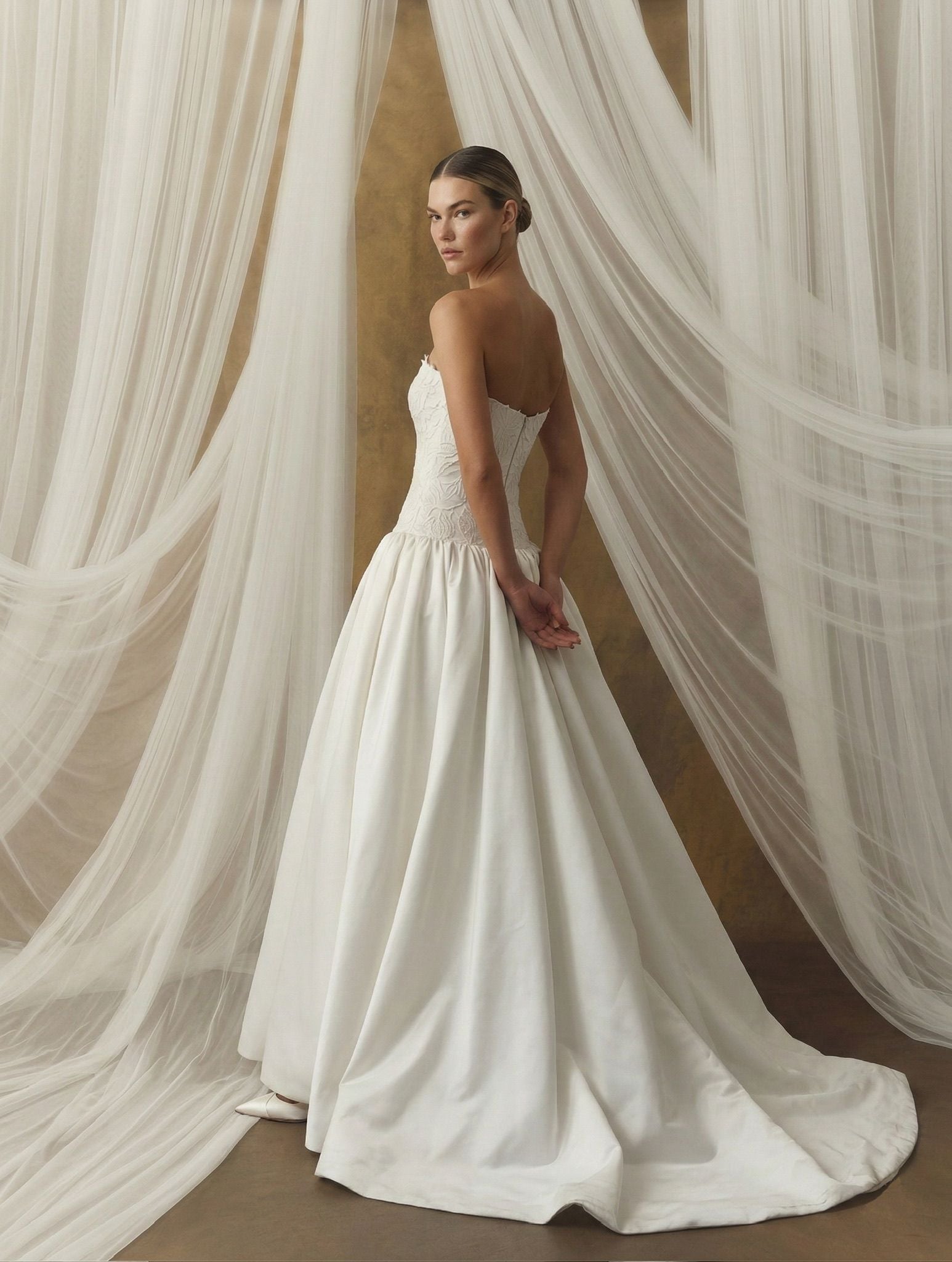 A princess skirt opening from the dropped waist carries volume with balance, completing the look.