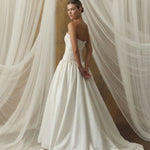 MAELLE is defined by its construction in mikado fabric and its dropped waist silhouette.