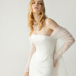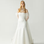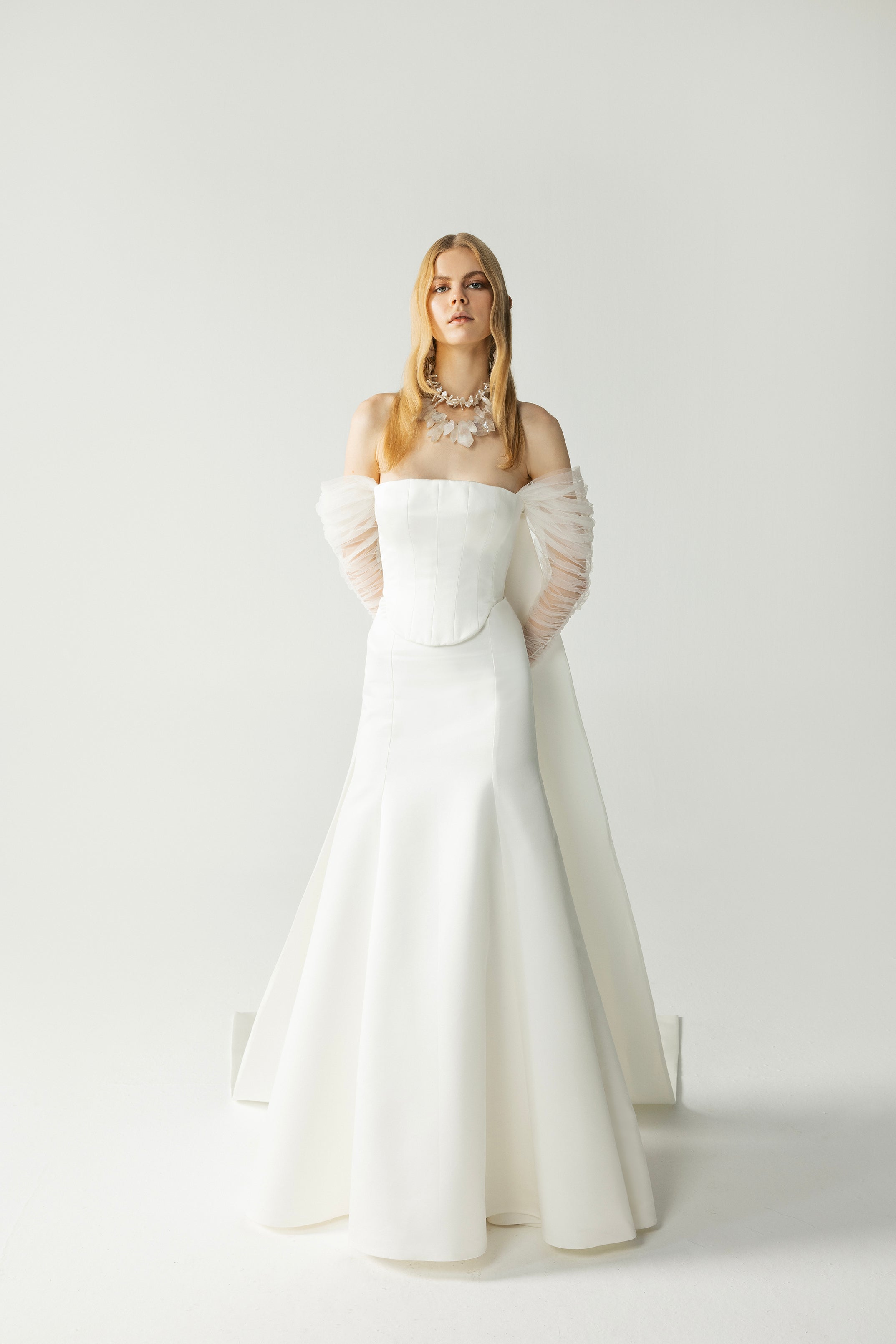 Victorian style bustier square neck silk satin mermaid gown with detachable skirt.