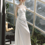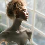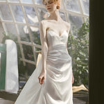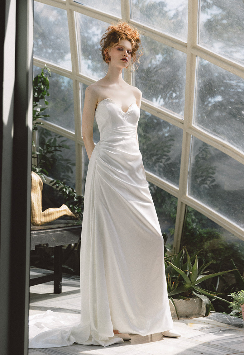 A lustrous satin gown with a bustier inspired by floral shapes and a one-sided draped skirt. The bustier’s edges are adorned with crystals and sequins.