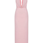 The front of the dress showcases a sleek, draped neckline that adds a touch of modern femininity, while the back reveals delicate strappy details adorned with small bows, offering a hint of playful allure. The form-fitting skirt accentuates your curves, and the high slit at the back ensures ease of movement and adds a touch of drama to your stride.