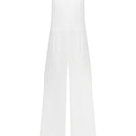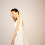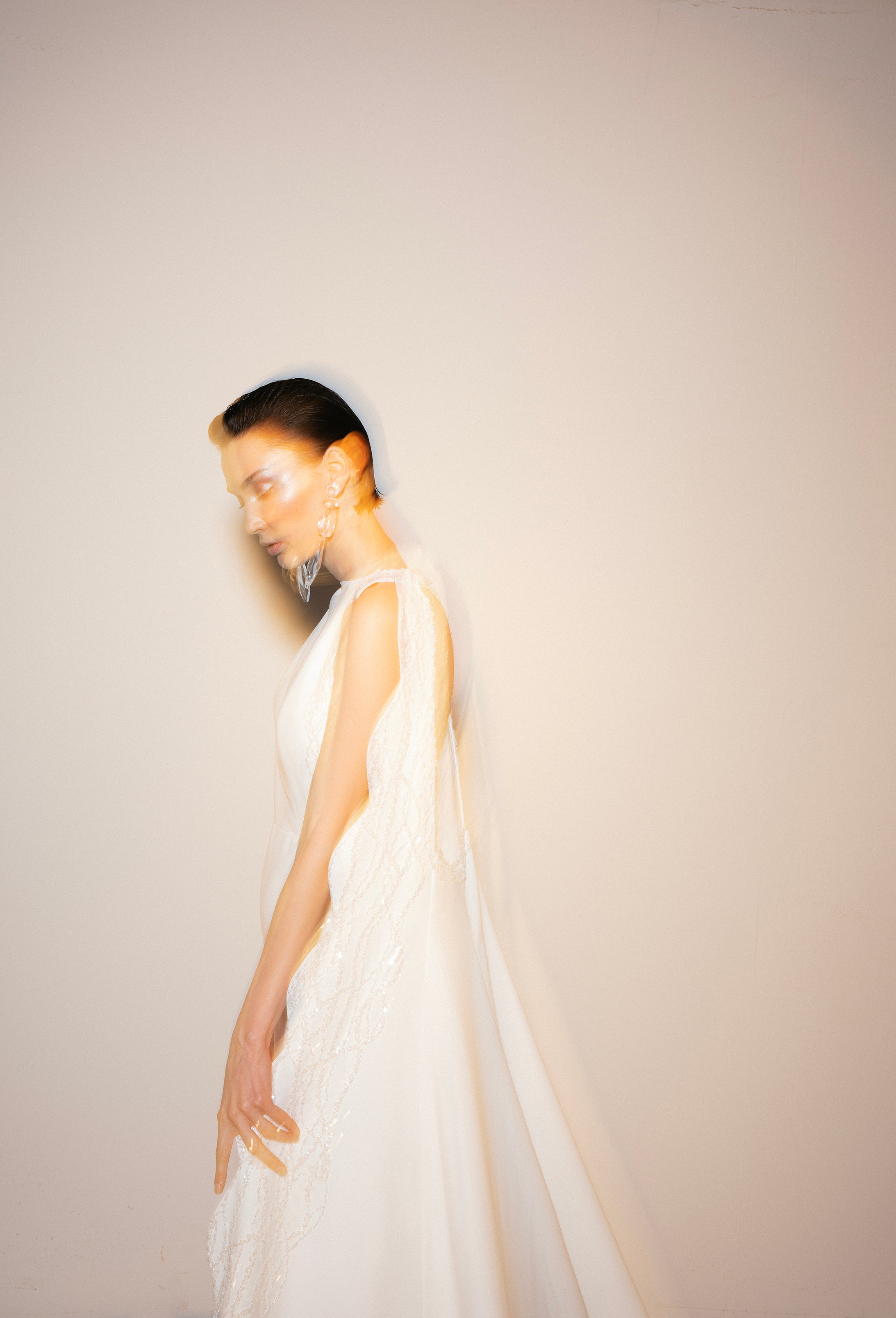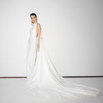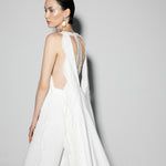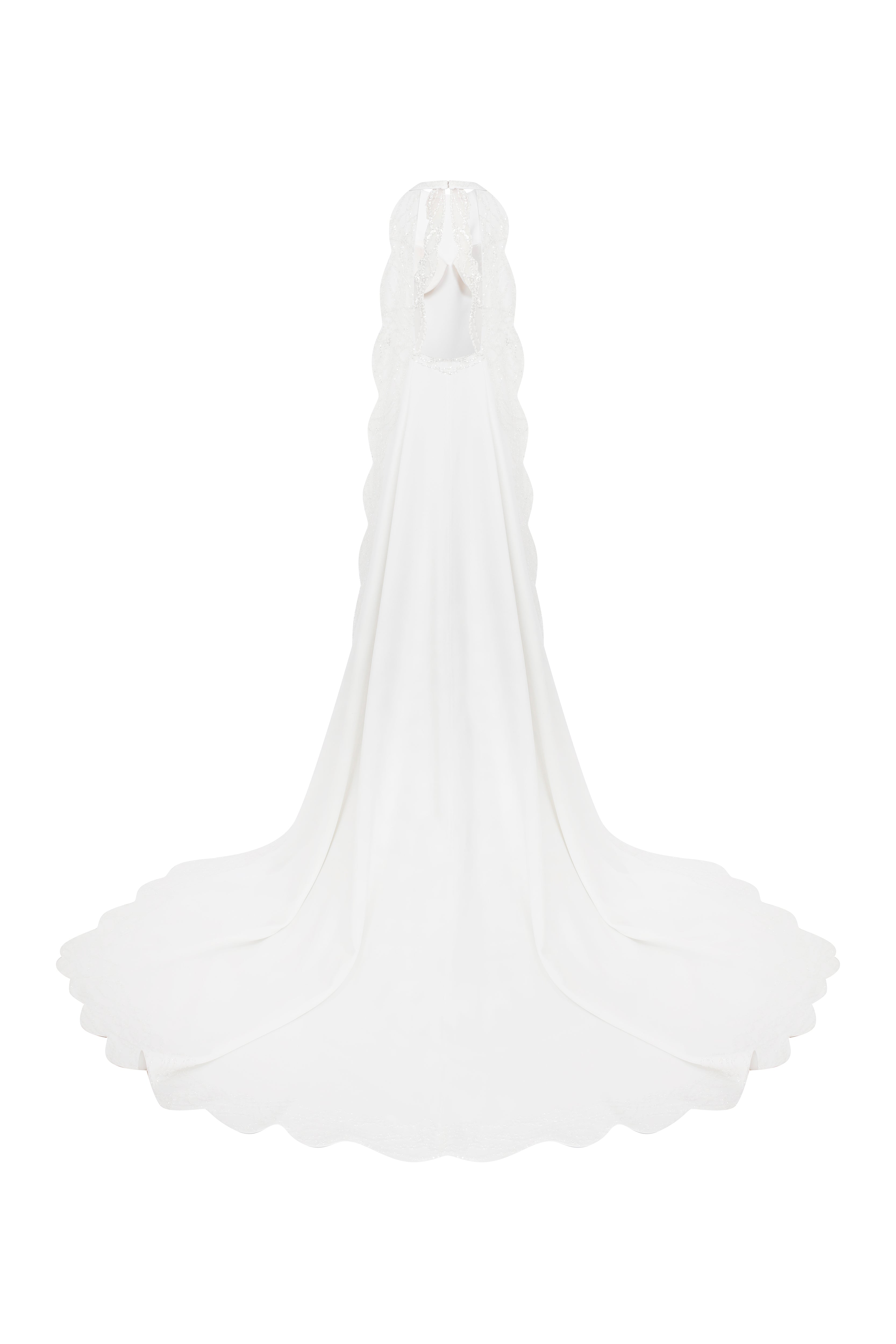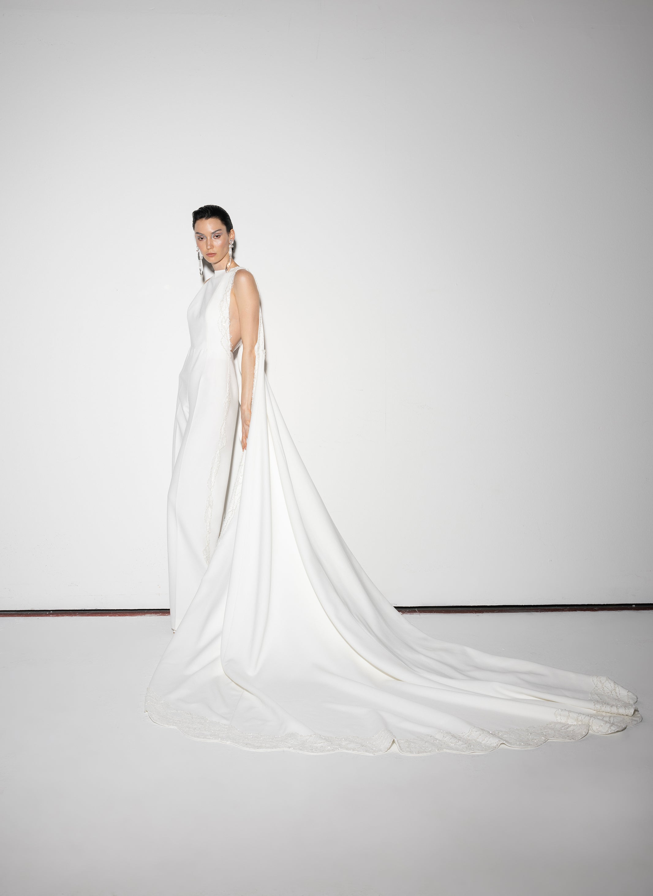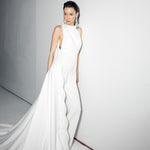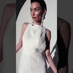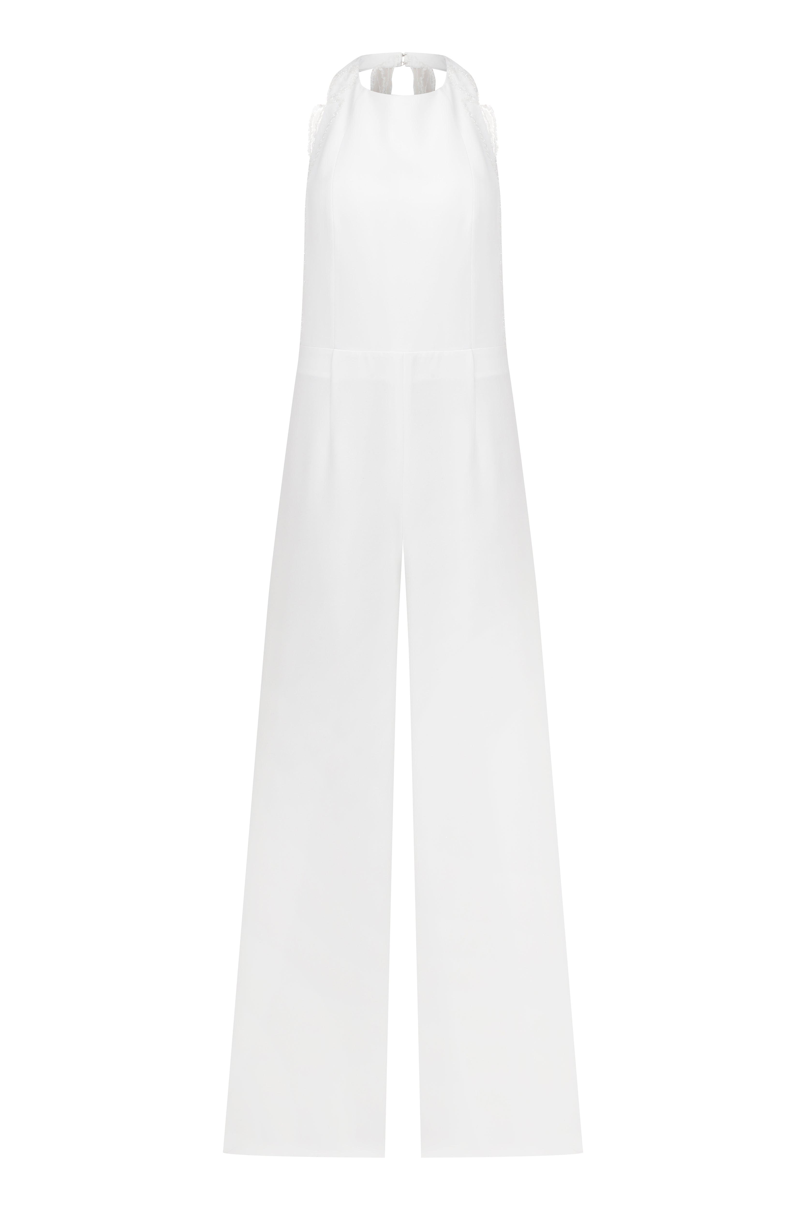 Halter neck crepe jumpsuit with beadings all over the sides and with two meters of detachable embellished cape.