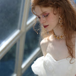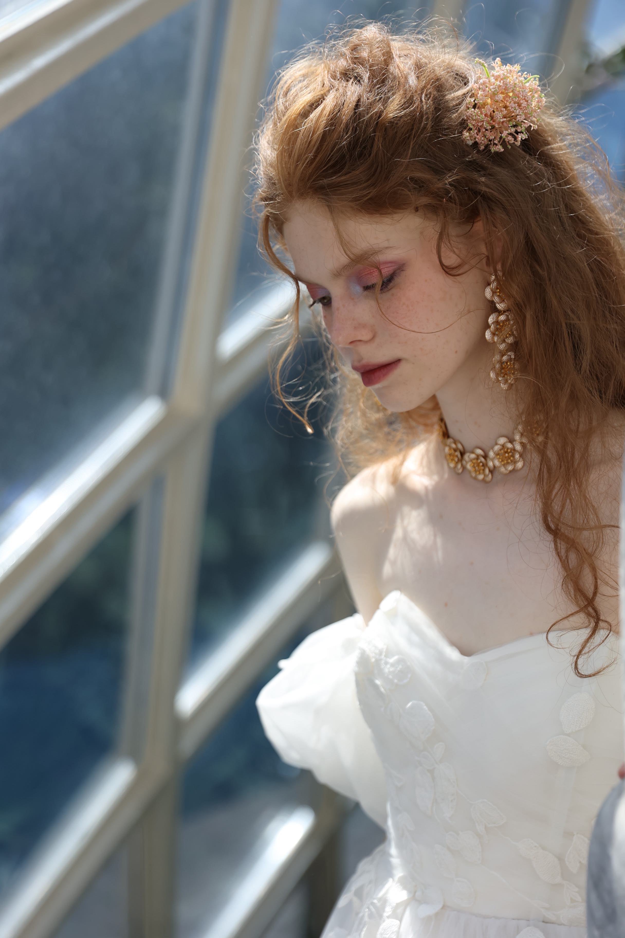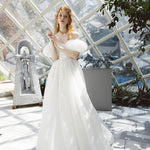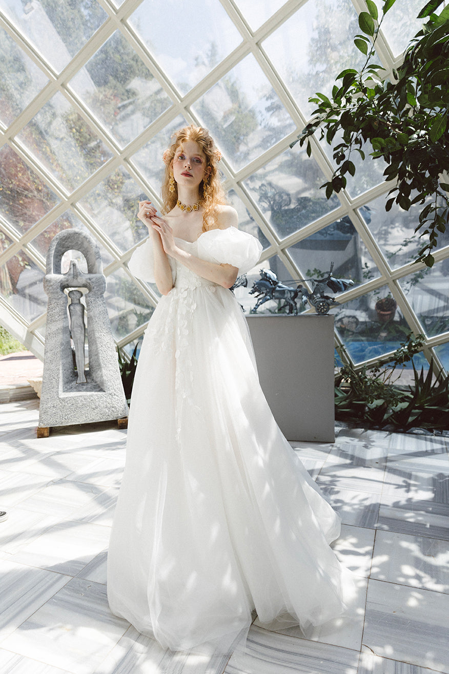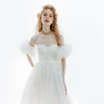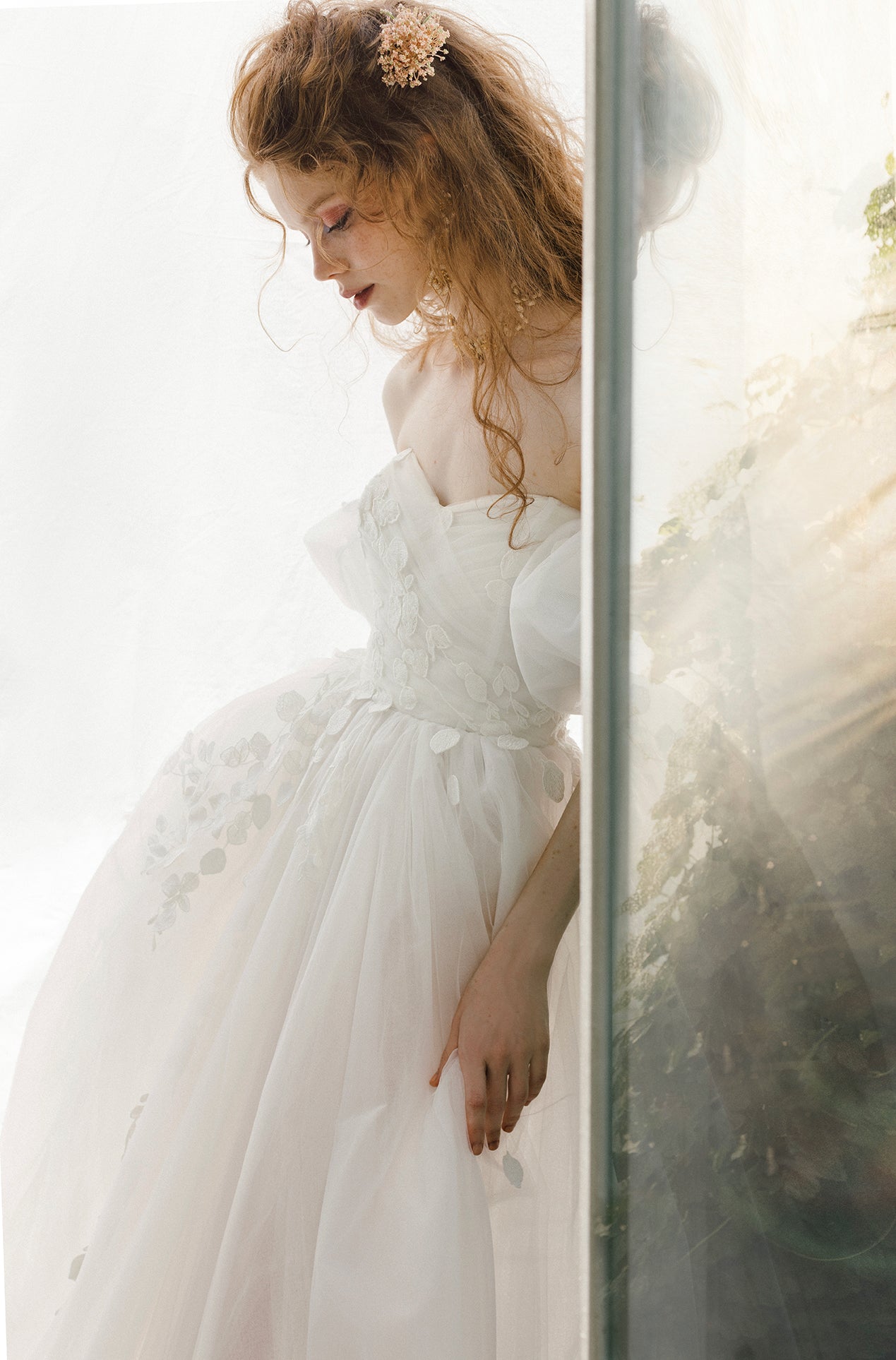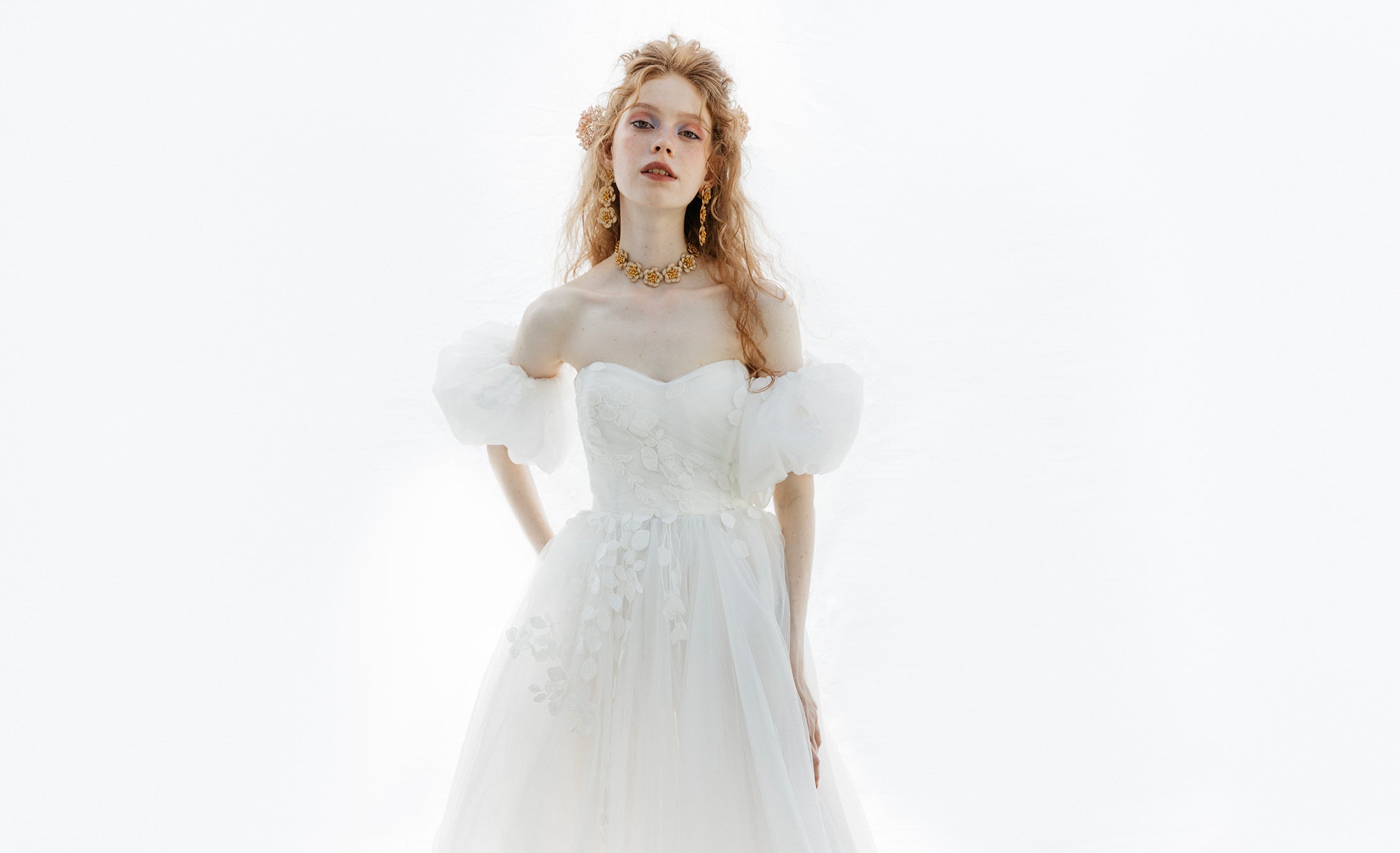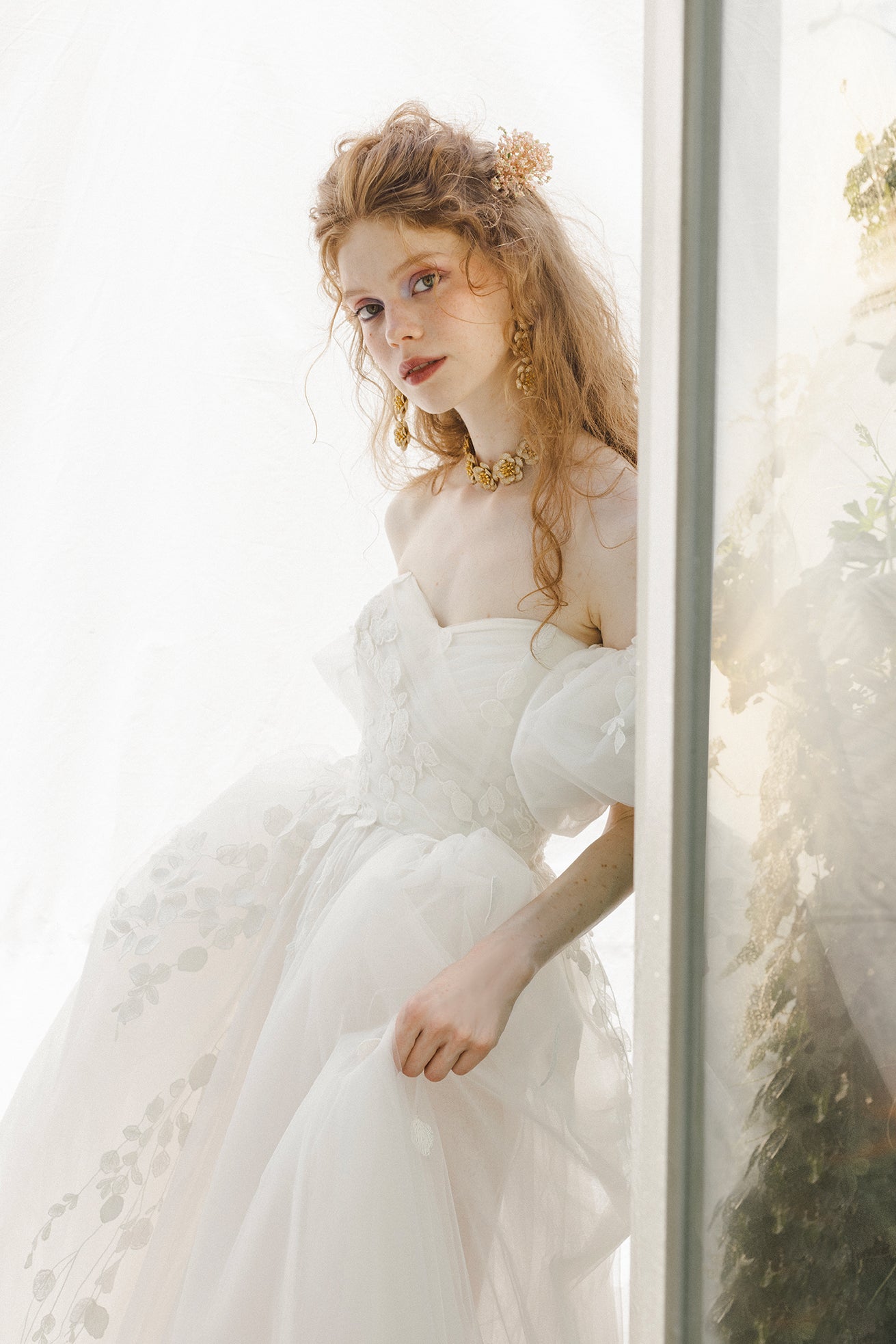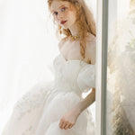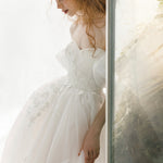 A strapless, corseted tulle ball gown featuring ethereal cloud-like sleeves and 3D floral embroidery on the bustier and skirt.