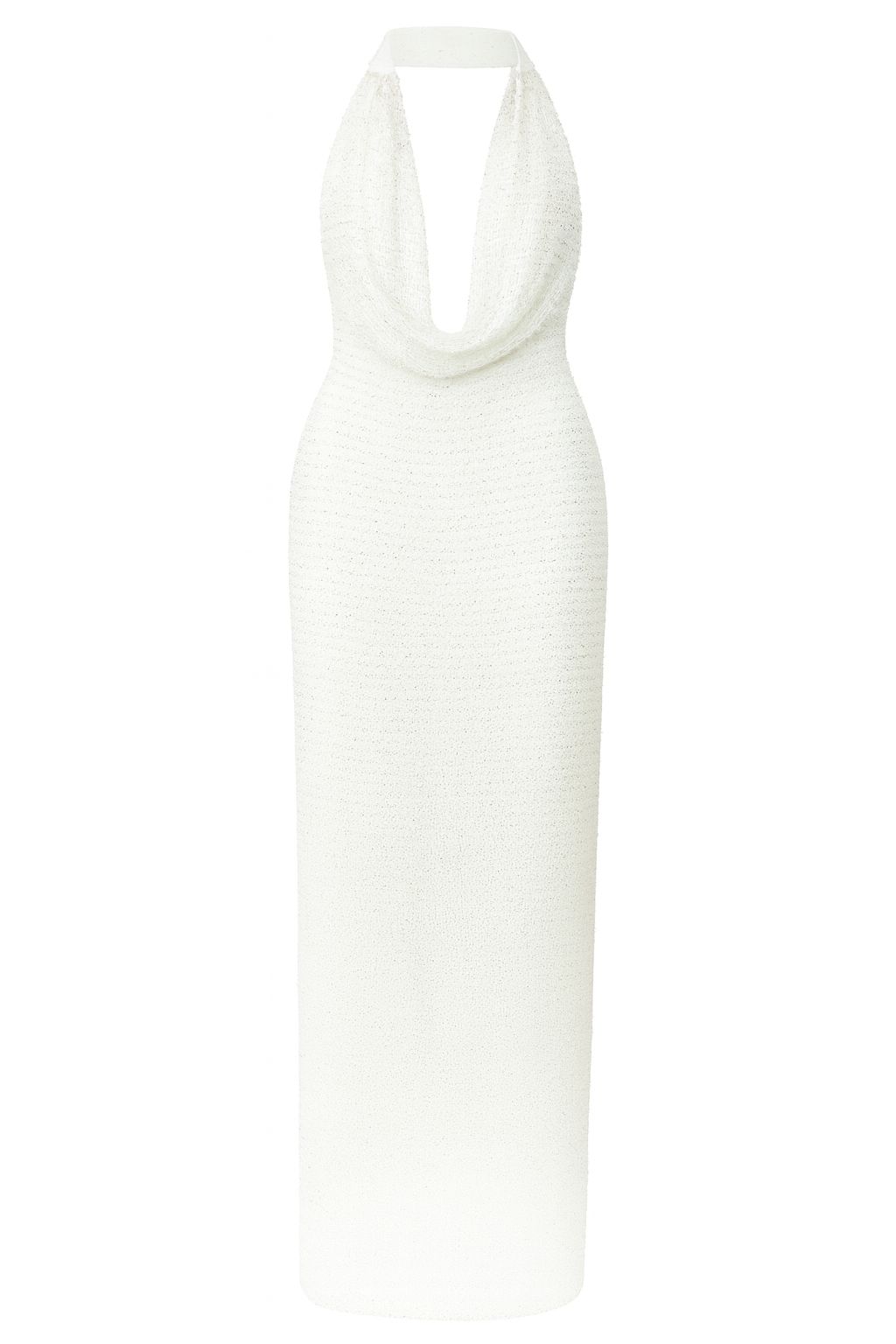 light and purity. Featuring a halter neckline with fluid draping and a fully open back down to the