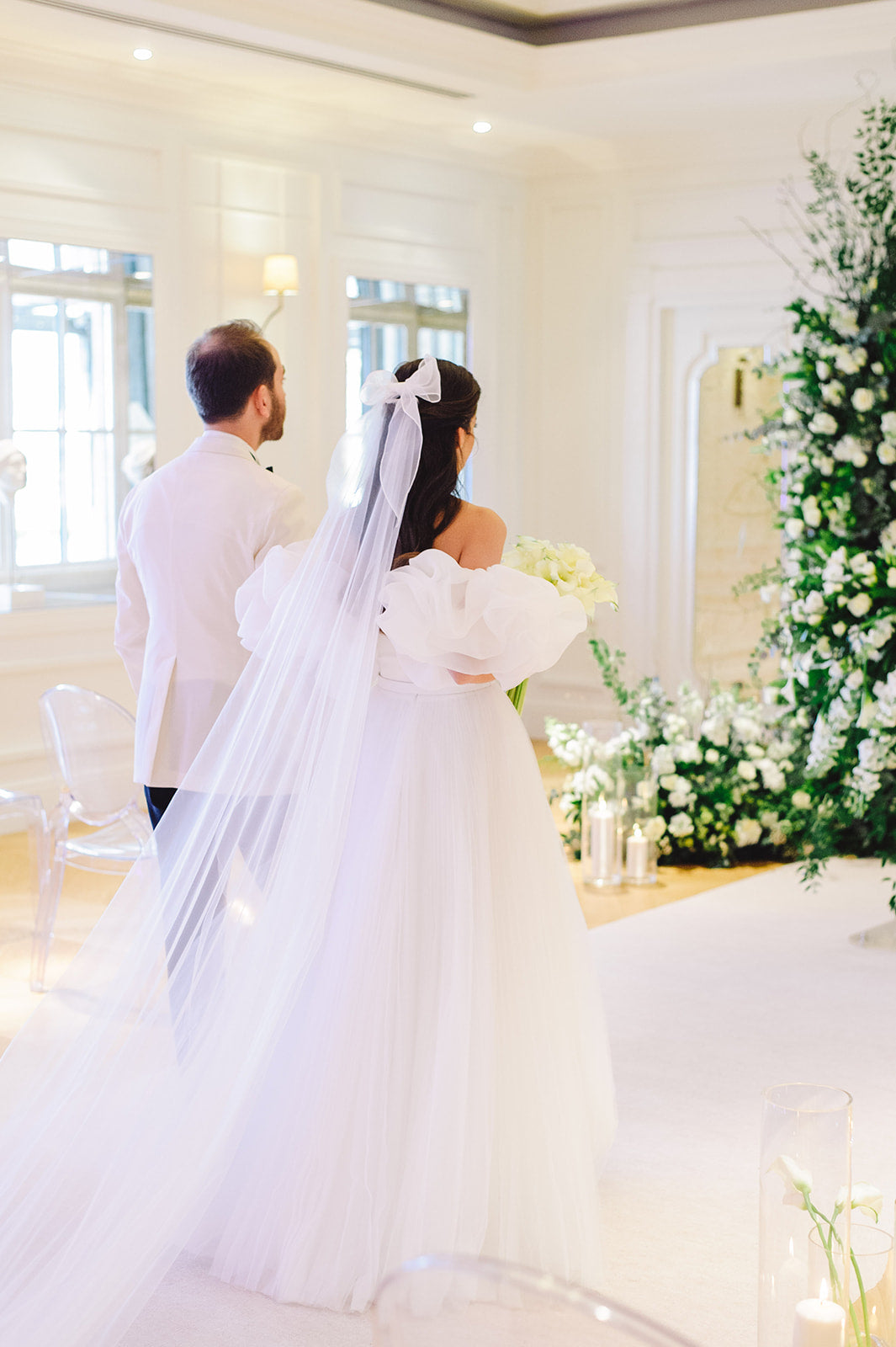 Classic style cut veil to a flirty walking length with its removable organza ribbon.