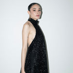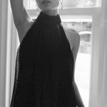 Tura is crafted from a lightly sheer fabric with intricate beading, featuring a halter neck design that accentuates the neckline. The mini-length cut and clean lines offer a simple yet striking look.