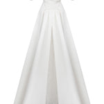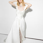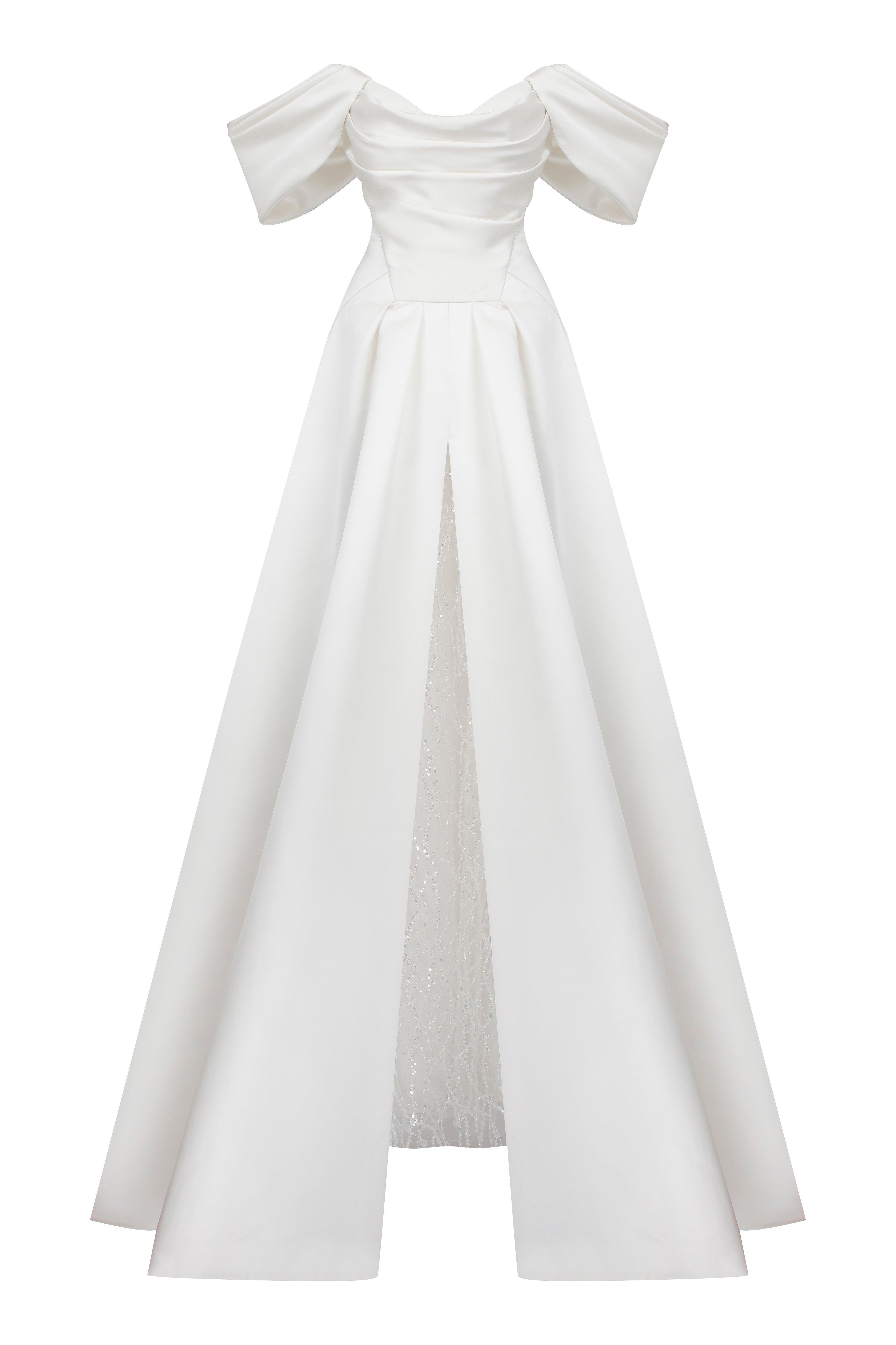 Assymetrical silk satin draped gown with open slit on the front, inside coming with attached embellished tulle skirt.
