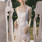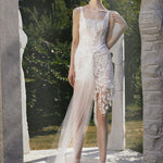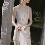 A square-neck, corseted mini dress featuring floral embroidery over lace, with 3D floral appliqués along the hem and a draped silk tulle detail at the front.